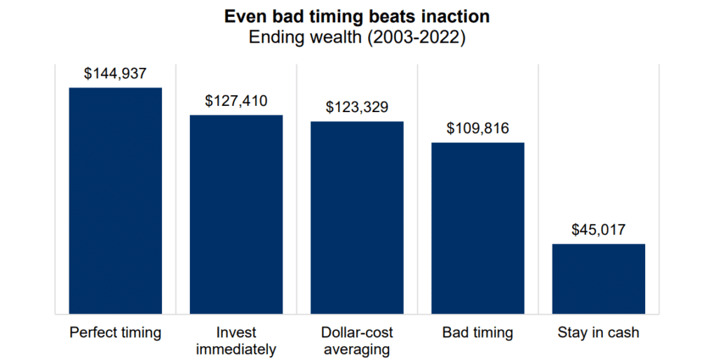 در آخر به یاد داشته باشید که بدون وجود شفافیت و در نظر گرفتن آینده زمانبندی بازار سرمایه تقریبا غیرممکن است. یک استراتژی برنده همیشه شامل یک برنامه و سرمایهگذاری منظم است. میانگین هزینههای دلاری هم میتواند در میان راه برای کسانی که سرمایهگذاری یکجا را استرسزا میدانند، راه مناسبی باشد.